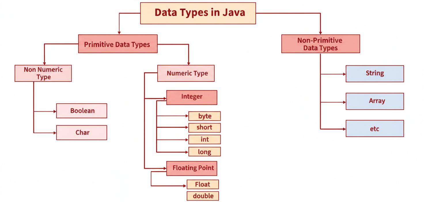 Data types in Java define the kind of data a variable can hold and the memory required to store it. They are broadly divided into two categories: